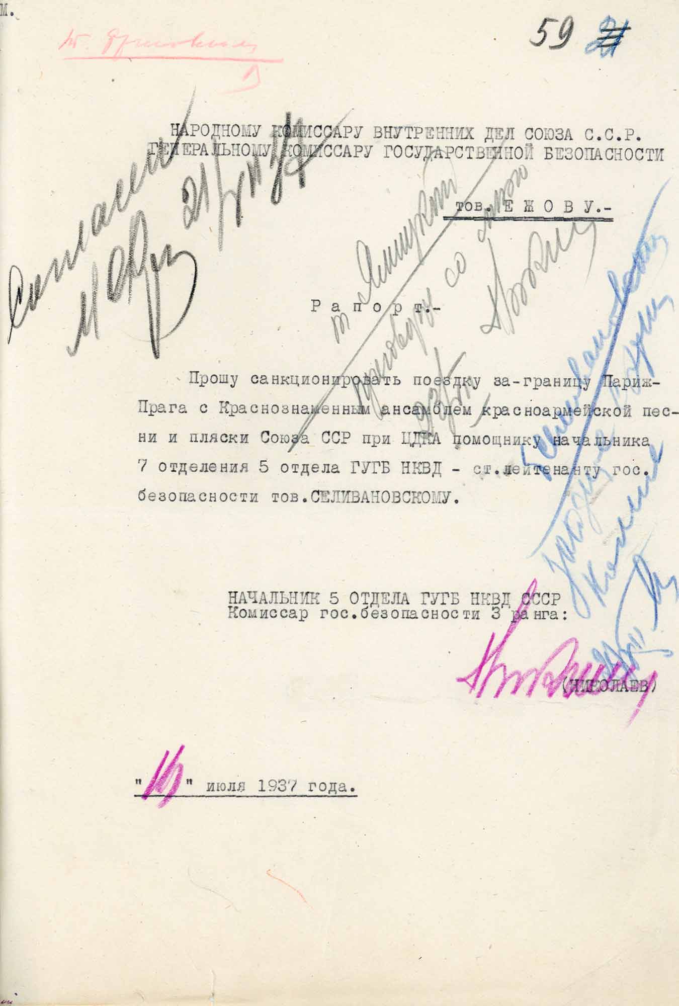 Рапорт на имя народного комиссара внутренних дел Союза ССР Ежова Н.И. о получении санкции на выезд за границу старшего лейтенанта государственной безопасности Селивановского Н.Н., 1937 г.