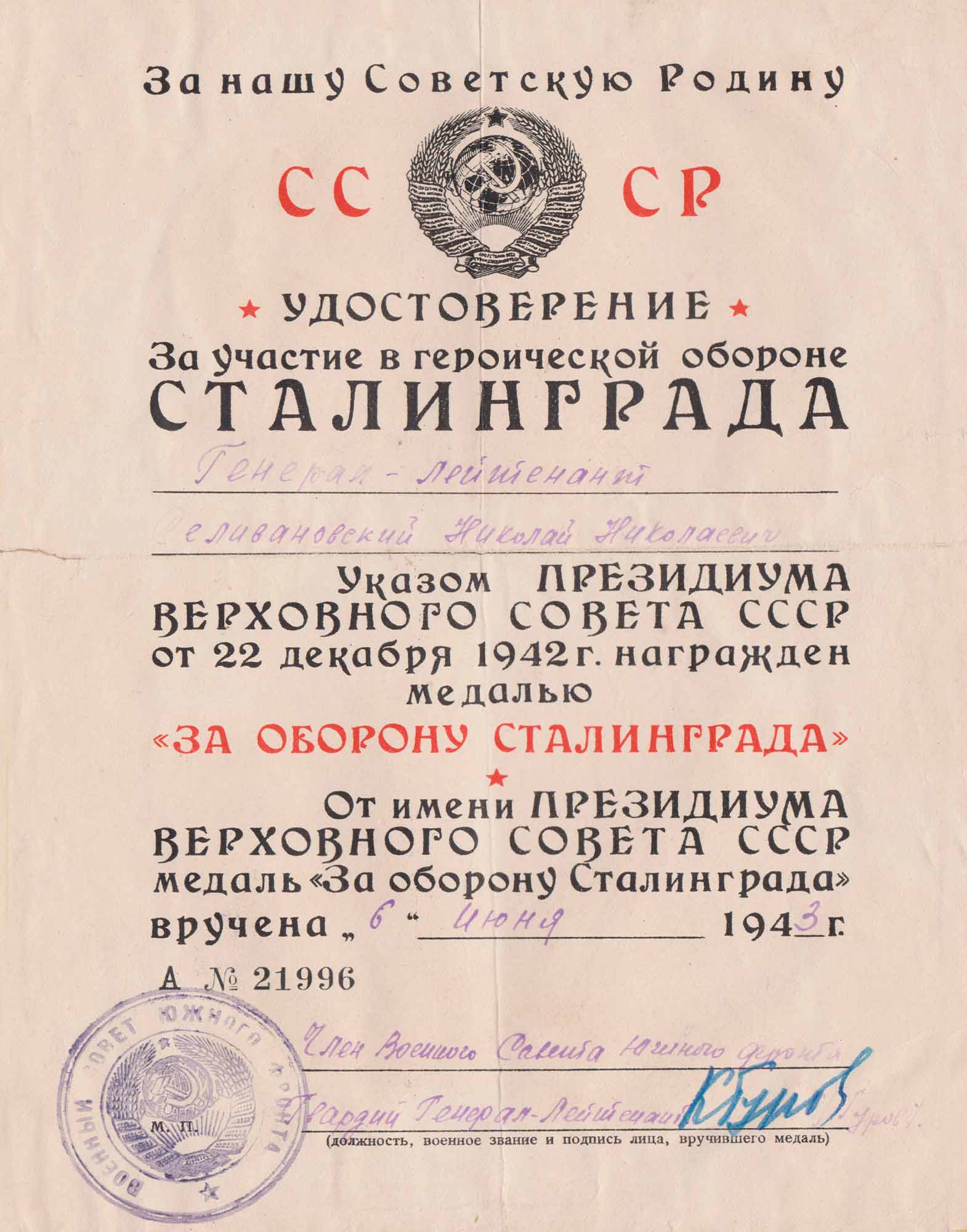 Удостоверение к медали «За участие в героической обороне Сталинграда», врученное генерал-лейтенанту Селивановскому Н.Н. 6 июня 1943 г.