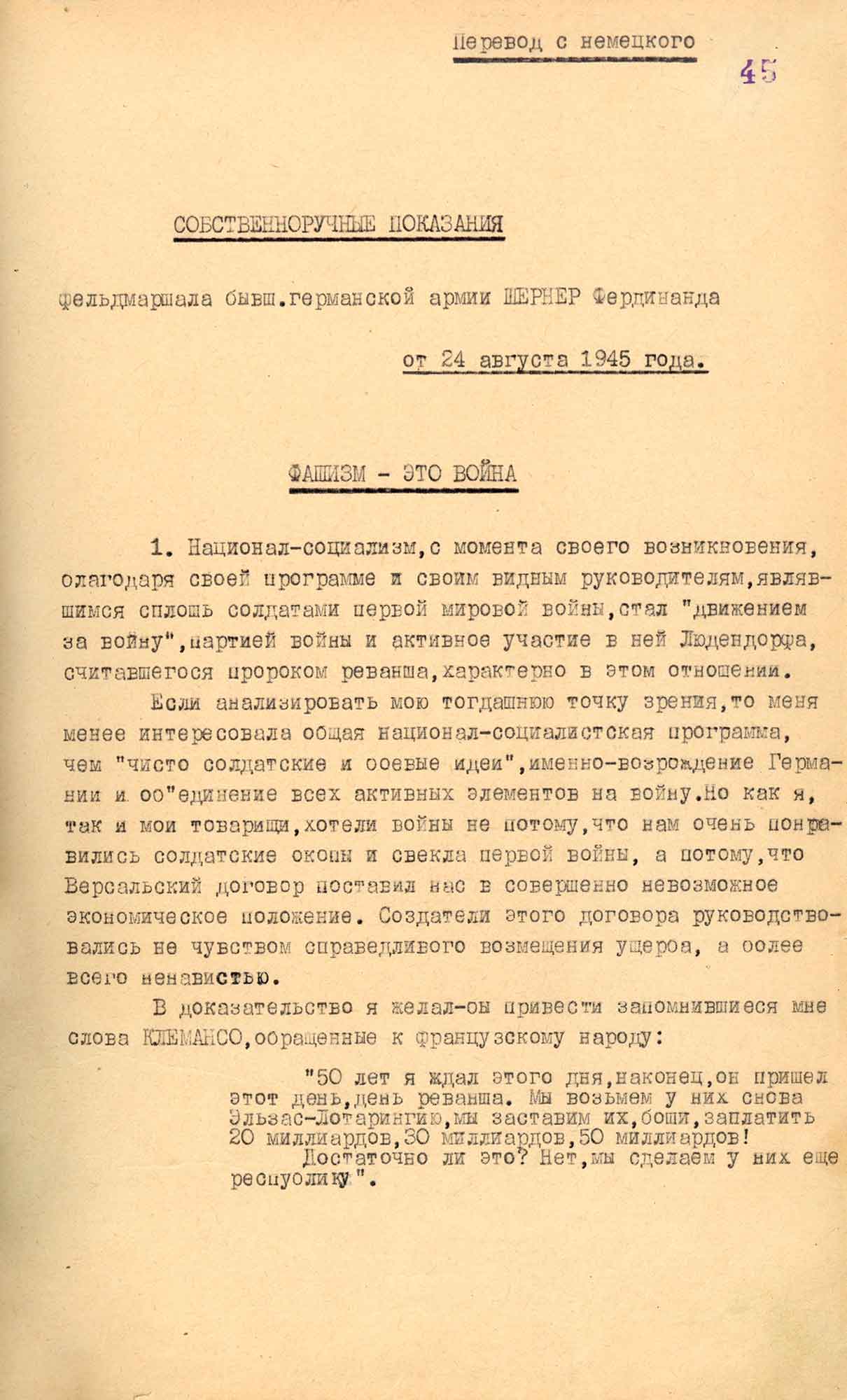 № 2. Показания генерал-фельдмаршала нацистской Германии Фердинанда Шёрнера, перевод с немецкого. 24 августа 1945 г.
