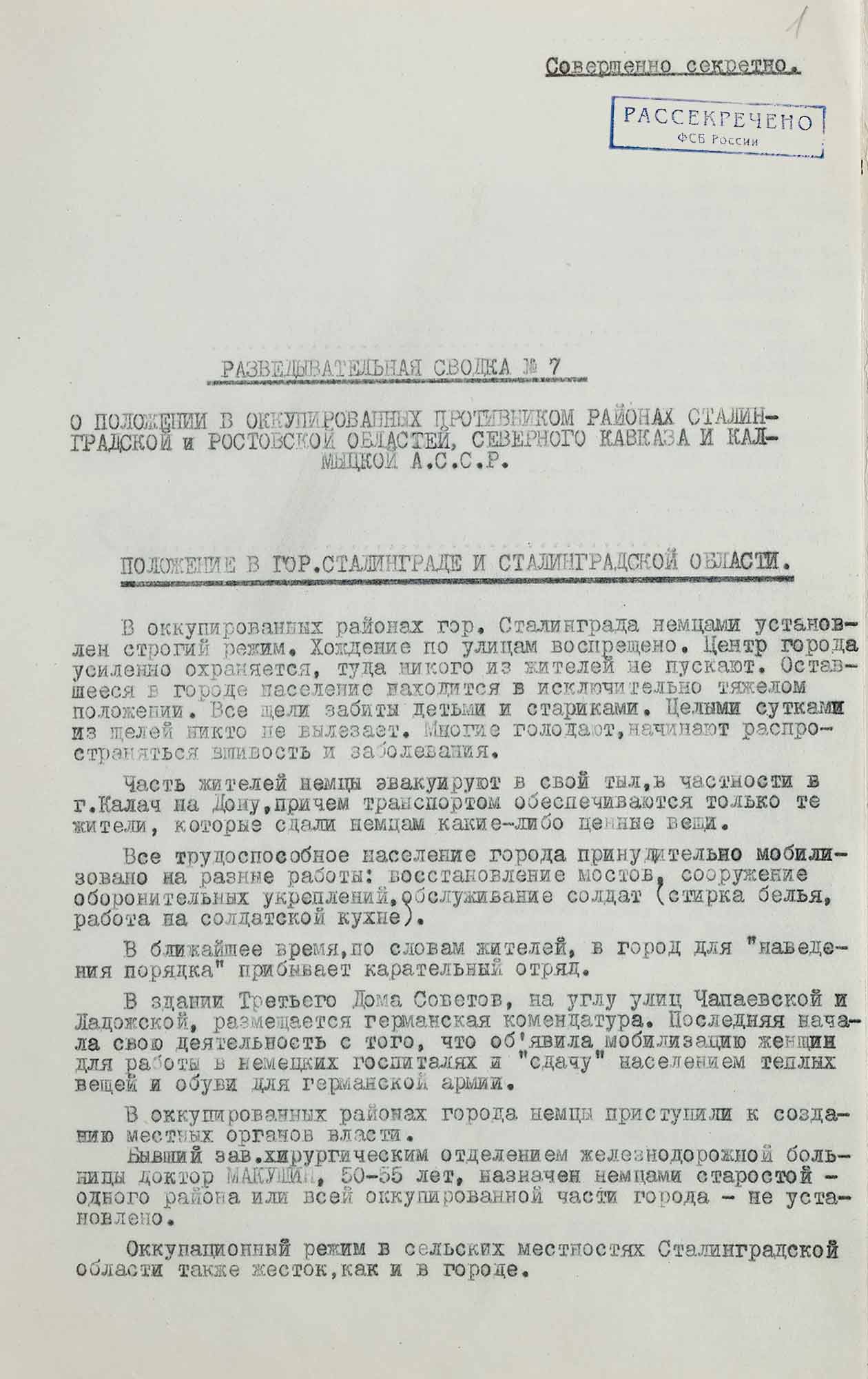 № 1. Разведывательная сводка № 7 4-го Управления НКВД СССР «О положении в оккупированных противником районах Сталинградской и Ростовской областей, Северного Кавказа и Калмыцкой АССР». 18 ноября 1942 г. Москва