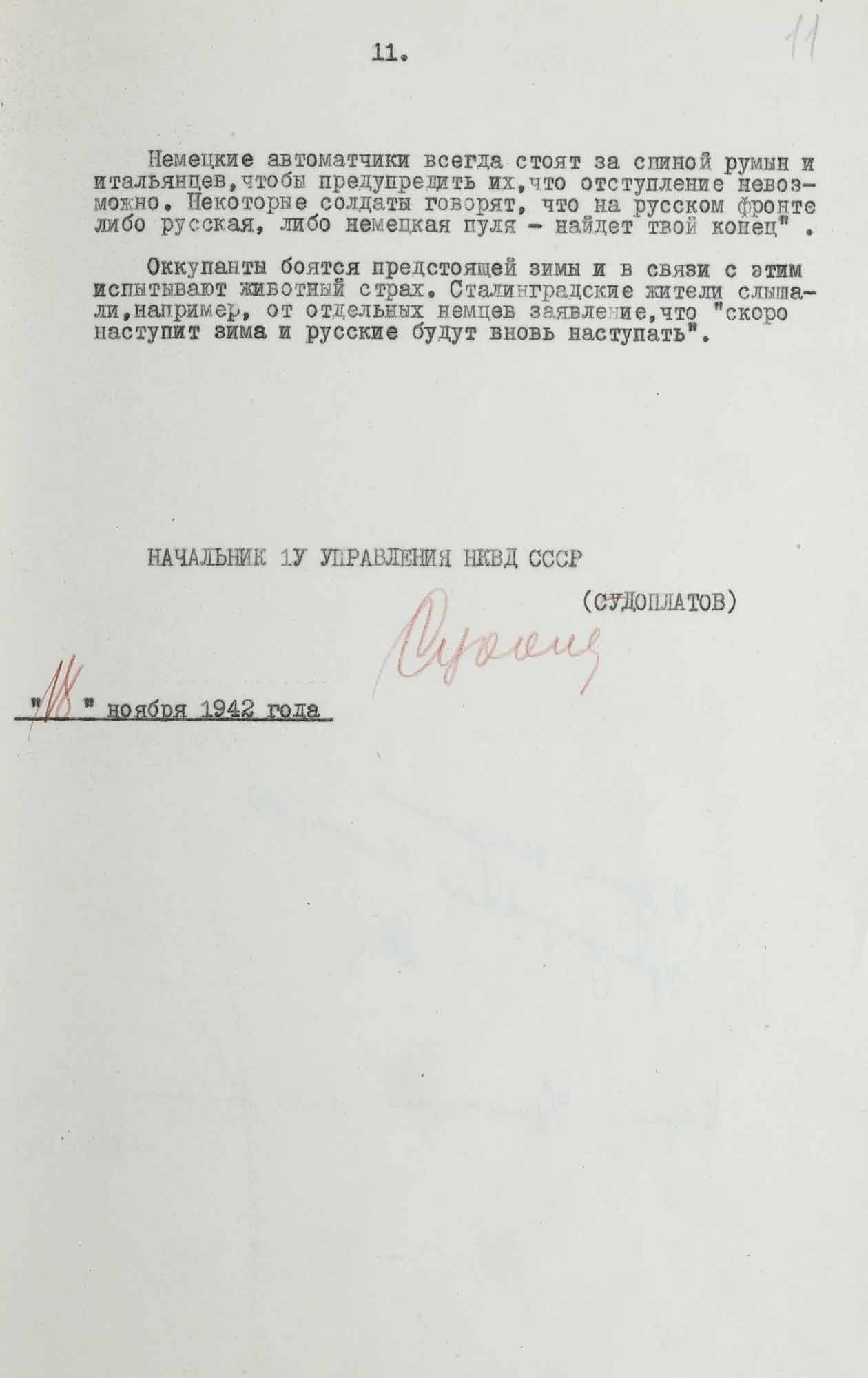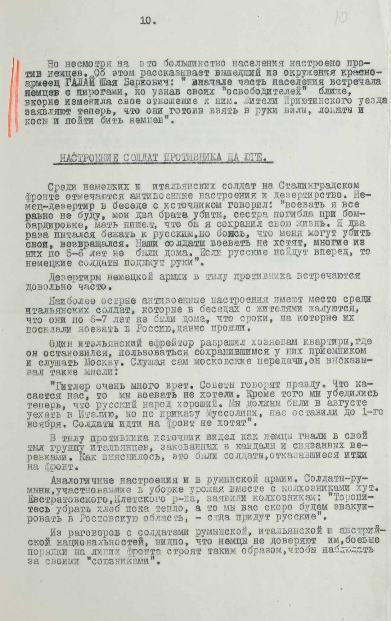 «Среди немецких и итальянских солдат на Сталинградском фронте отмечаются антивоенные настроения и дезертирство [...] Немец-дезертир в беседе с источником говорил: [...] Если русские пойдут вперед, то немецкие солдаты подымут руки [...]