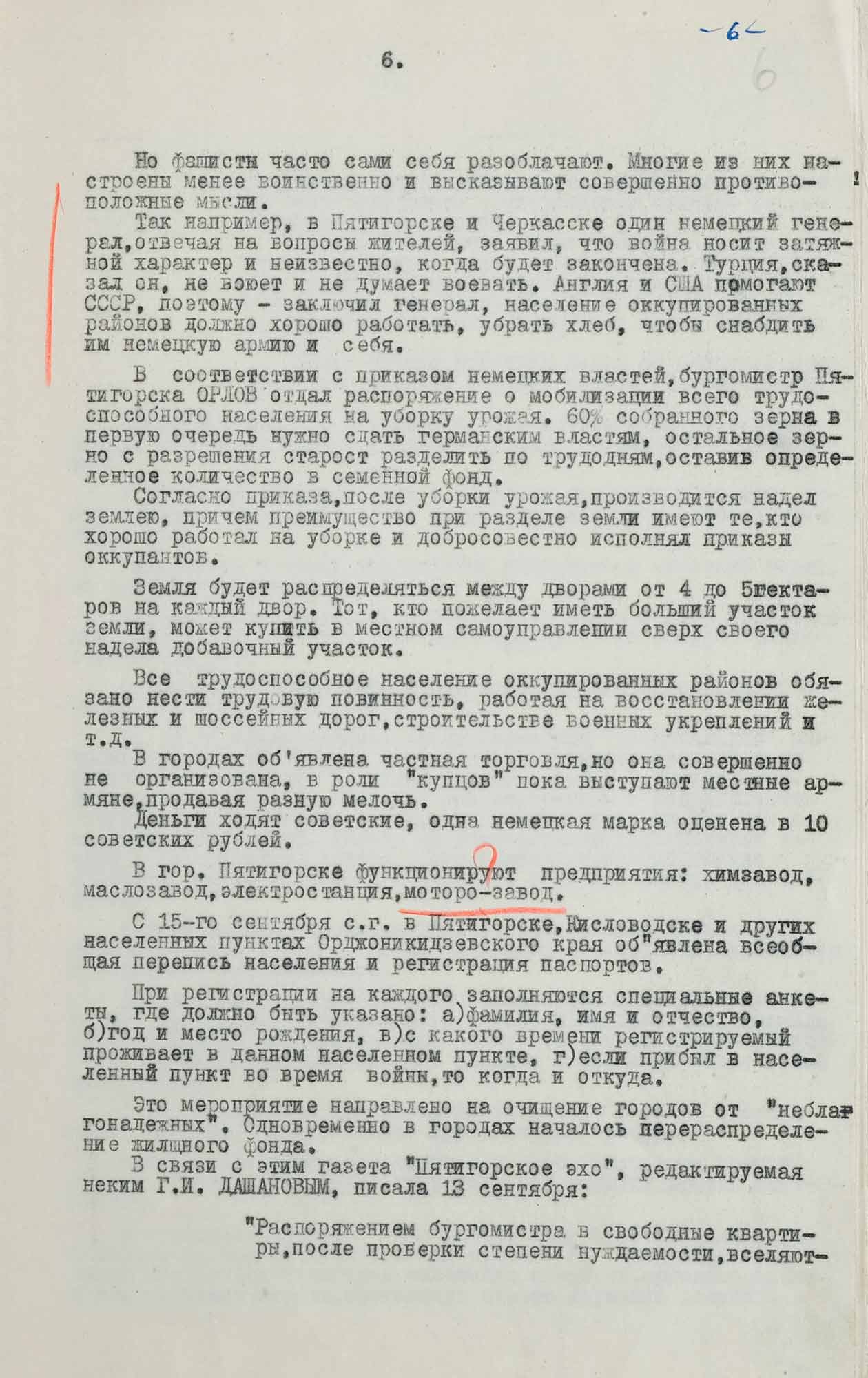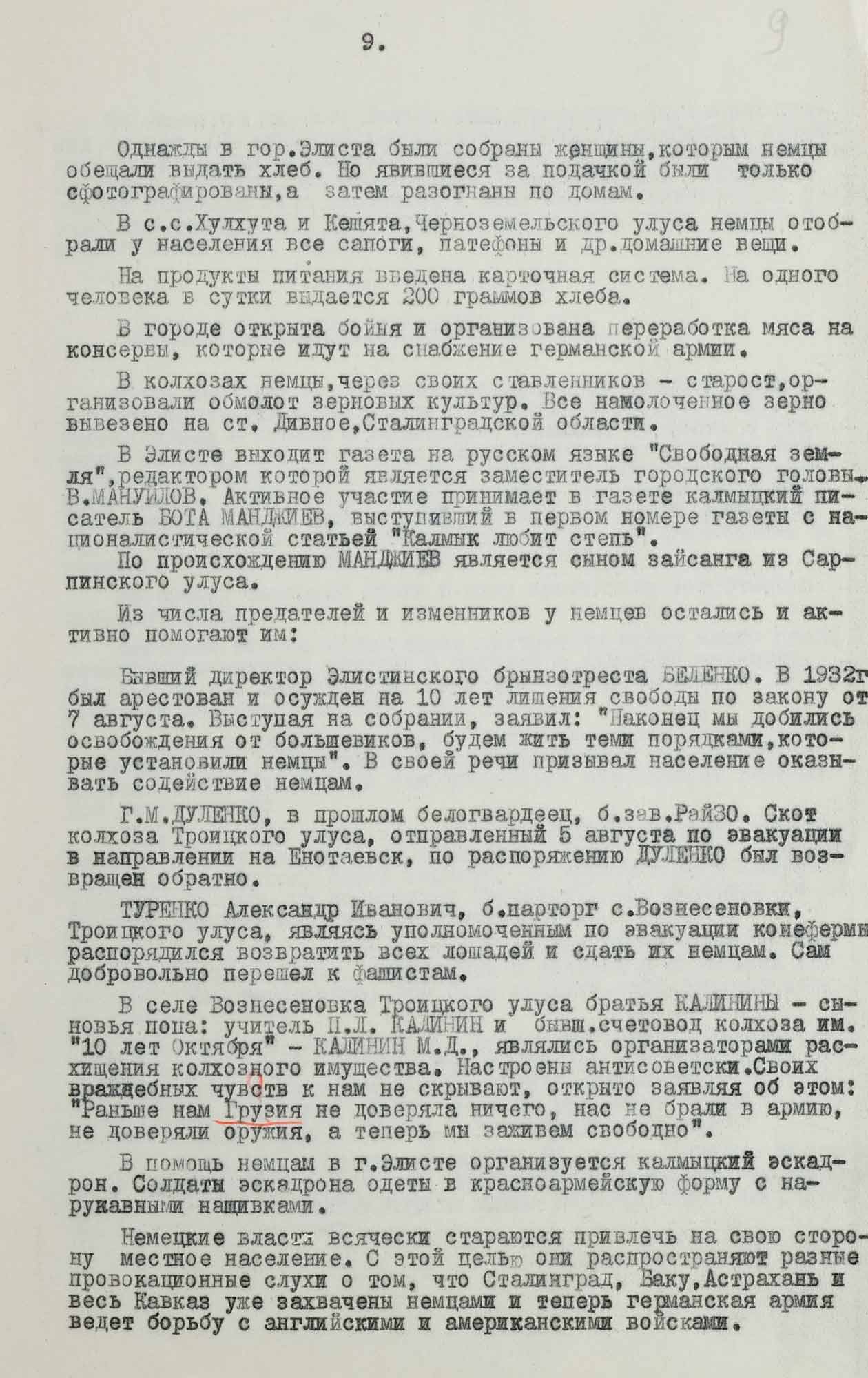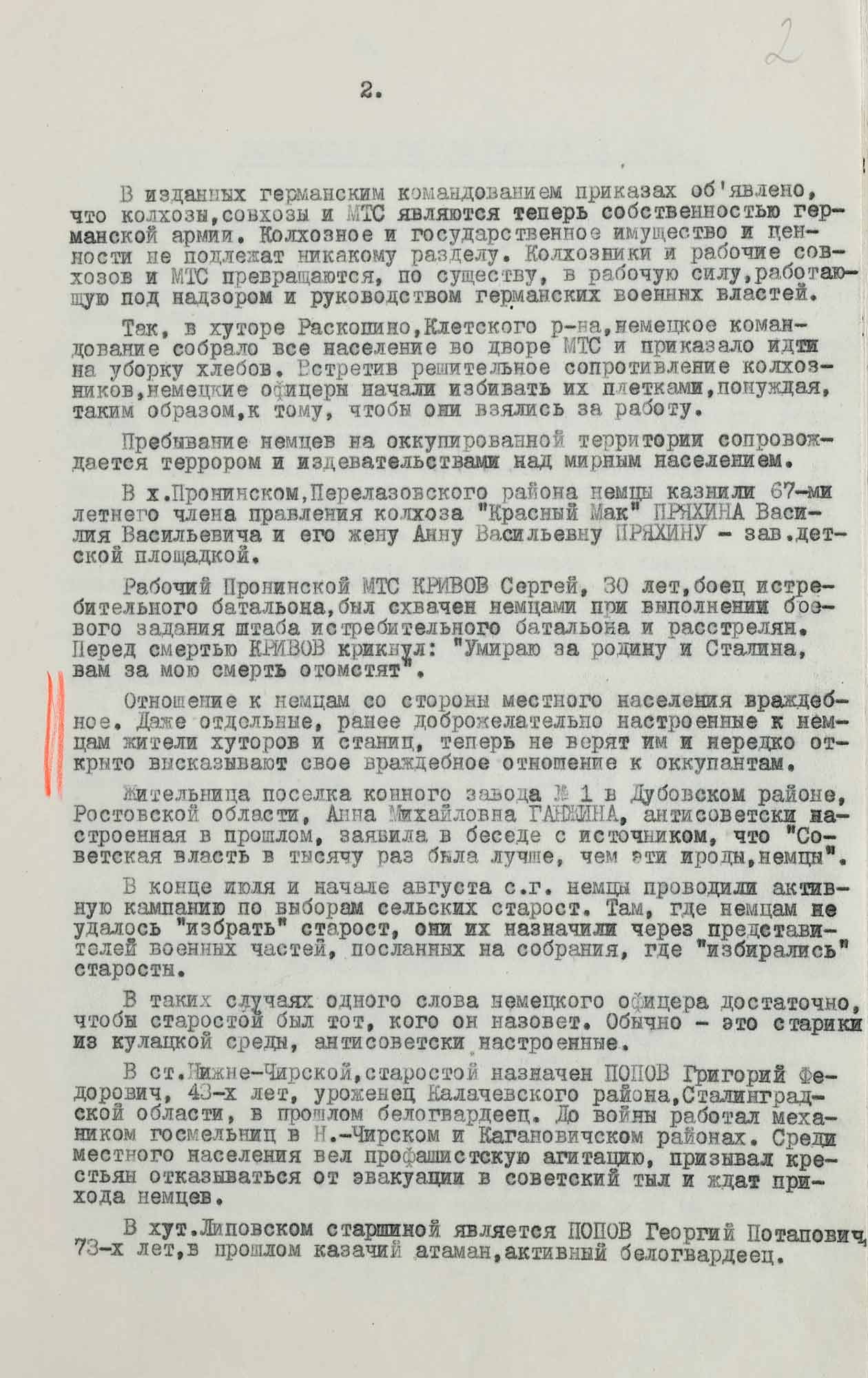 Жительница поселка конного завода № 1 в Дубовском районе Ростовской области, Анна Михайловна Ганжина, антисоветски настроенная в прошлом, заявила в беседе с источником, что „Советская власть в тысячу раз была лучше, чем эти ироды, немцы“ [...]».