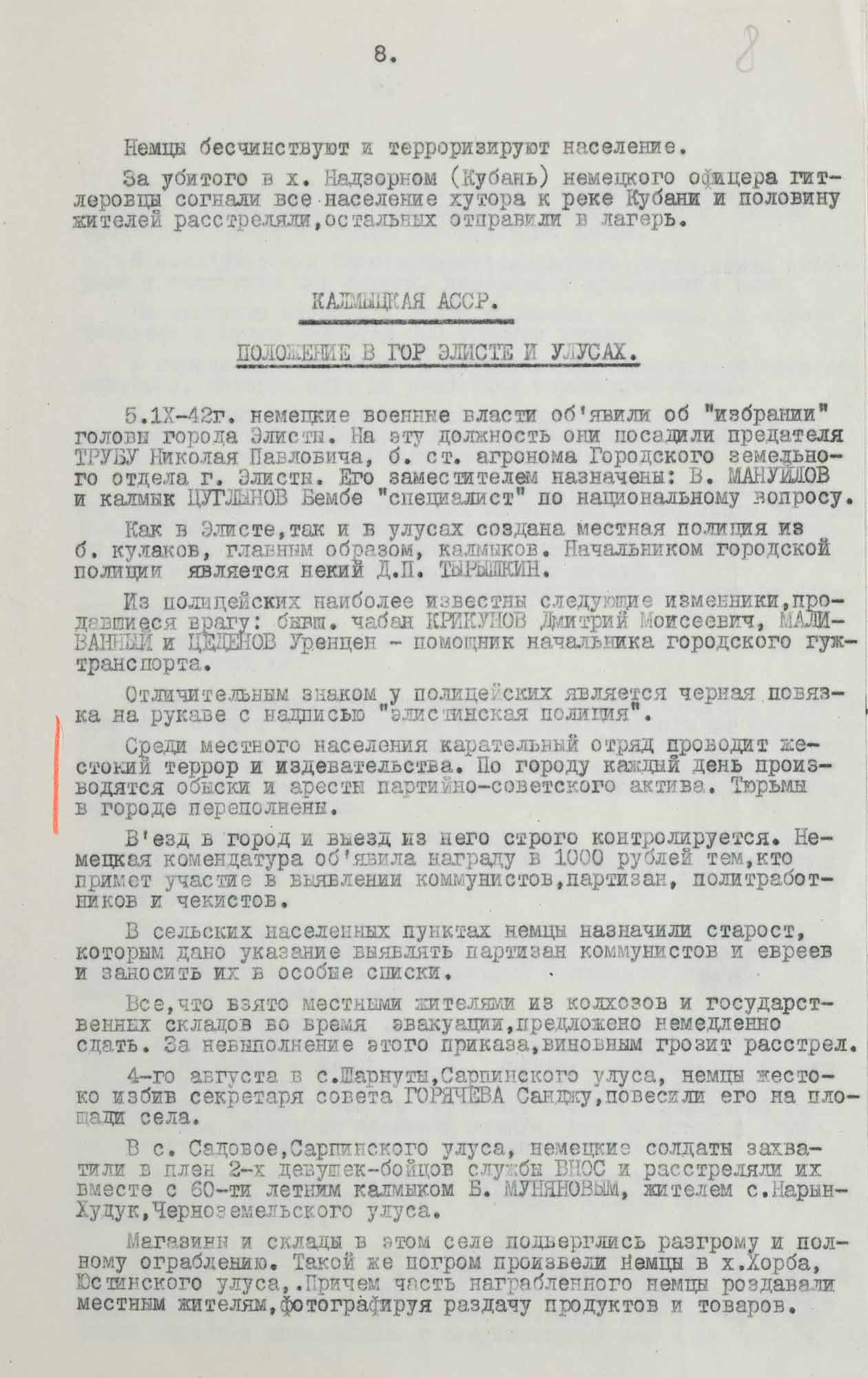 Разведывательная сводка № 7 4-го Управления НКВД СССР «О положении в оккупированных противником районах Сталинградской и Ростовской областей, Северного Кавказа и Калмыцкой АССР». 18 ноября 1942 г. Москва