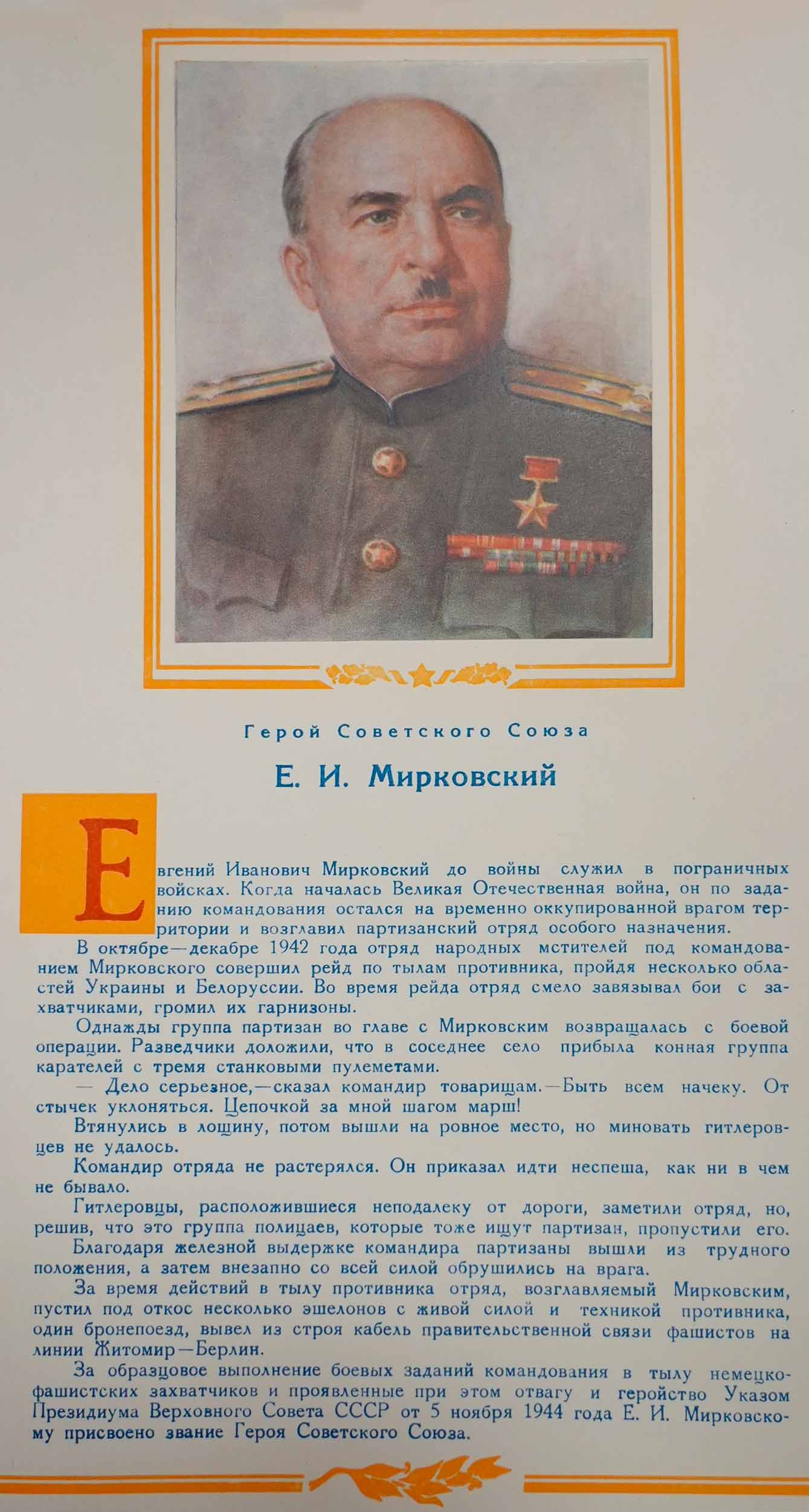 Мирковский Евгений Иванович, белорус, родился 31 января 1904 г. в Минске, в семье служащего. Начал трудовую деятельность в 1921 г. Работал слесарем бондарной мастерской в г. Дмитриев-Льговский Курской губернии, бетонщиком строительного участка в Минске. Без отрыва от работы окончил рабфак. С 1926 г. — сотрудник полномочного представительства ОГПУ по Западному краю. С 1927 г. по 1941 г. служил в Пограничных войсках НКВД СССР на западной границе Советского Союза, которая в 1920-е годы была «воюющей границей». Из Польши через советскую границу постоянно проникали на территорию страны вооруженные отряды Булак-Булаховича, Савинкова, Премыкина и других противников советского государства. Вооруженные провокации против советских пограничников совершали и регулярные подразделения Польской армии. Именно в ходе службы в пограничных войсках будущий Герой Советского Союза Е.И. Мирковский получил свой первый боевой опыт, во многом определивший его успешный боевой путь. В 1931 г. он прошел базовую для того времени военную подготовку на 35-дневных сборах Начсостава Погранчастей ОГПУ СССР при ОБВШ имени ЦИК БССР (объединенная белорусская военная школа имени ЦИК БССР — среднее военное учебное заведение, действовавшее в 1920-х, 1930-х годах в Минске — сост.). Весной 1941 г. Е.И. Мирковский проходил обучение в Высшей школе НКВД СССР. С июля 1941 г. капитан Е.И. Мирковский — командир отряда (роты) Особой группы (позднее — Отдельной мотострелковой бригады особого назначения) НКВД СССР. Участвовал в боях за Москву, выполнял задания за линией фронта.